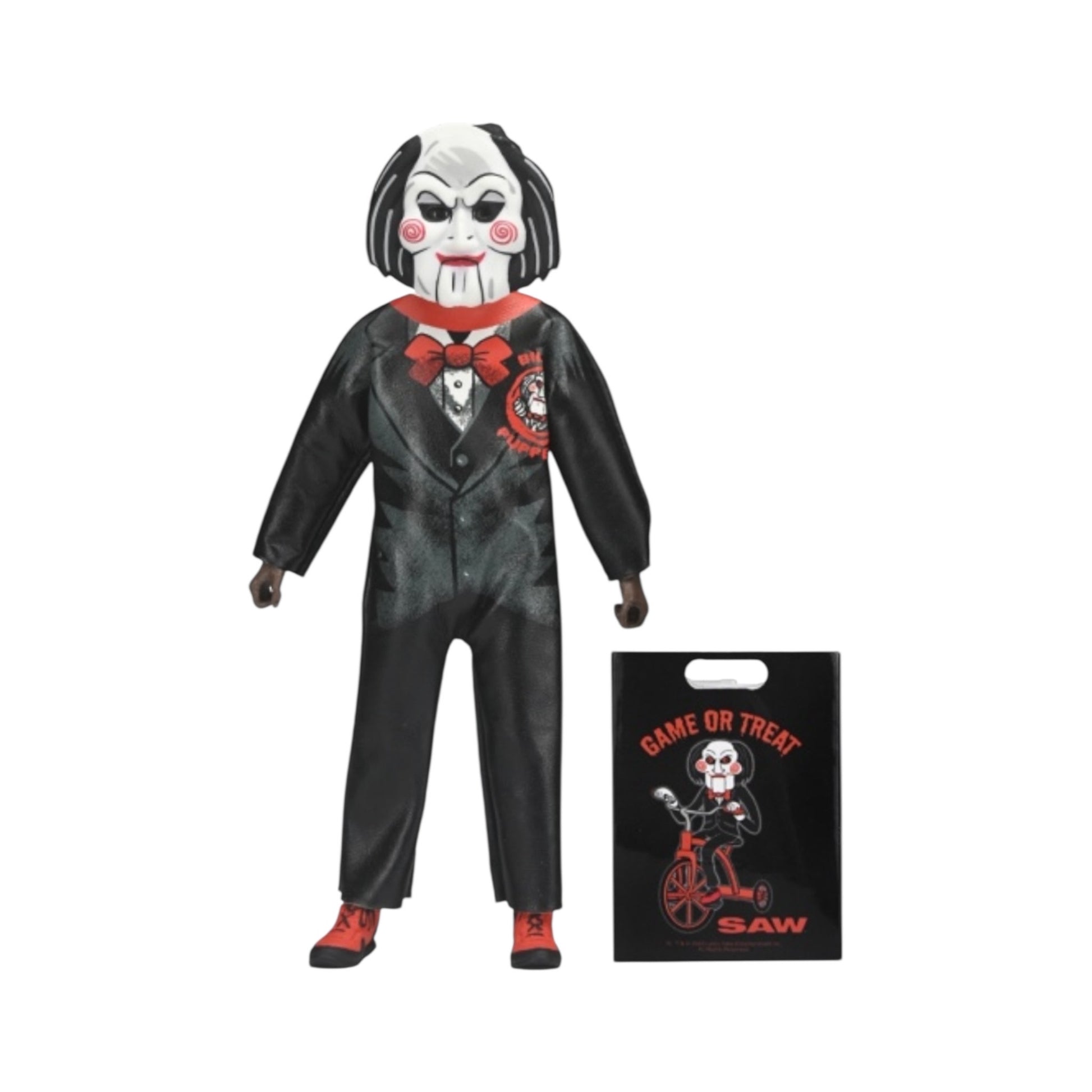 The Ben Cooper Costume Kids Collection is back with Series 9, bringing a fresh batch of spooky trick-or-treaters to your shelf! Based on the licensed kids’ costumes from one of the largest Halloween costume manufacturers from the 1950s–‘80s, these fully poseable 6-inch figures perfectly capture the vintage charm of the looks from that era. This wave features NECA’s original designs in the style of Ben Cooper costumes as if they were produced today, reimagining the legendary horror villains Leatherface (Texas Chainsaw Massacre), Michael Myers (Halloween 2), Billy the Puppet (Saw), Pennywise (2017’s IT), and Art the Clown (Terrifier). Wearing a mask and soft goods clothing replicating the vinyl look of classic costumes, each frightful figure comes complete with a movie-specific trick-or-treat bag or pumpkin bucket accessory. Every figure is sold separately and packaged in a numbered, retro-style window box that pays homage to the classic costume packaging.